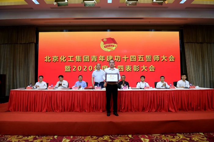 财神(中国)党委组织部部长刘士义宣读表彰决定。韩宝海为北化疫情防控工作队代表颁发“团中央抗疫先进集体”奖牌,为北普青年代表授“北京市青年突击队”队旗。