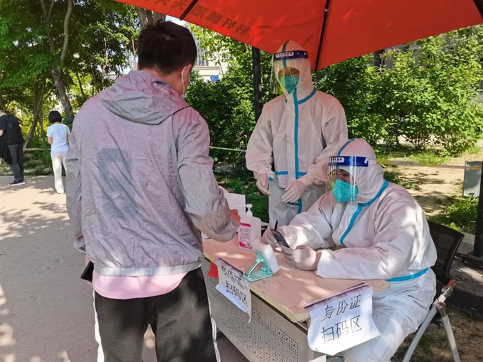 自5月中旬以来,我下沉到通州区东惠北里社区府东苑小区从事核酸检测信息采集工作。这段时间我负责验证登记,为居民发放检测管。这工作不难,但却责任重大,它关乎每一位检测人员的健康宝查询情况,虽然看上去只是对准居民身份证采集了信息,但实际上,在录入信息的数秒钟时间里,要完成信息的完整录入、信息的准确查验等工作。我每次都会比对录入信息和居民身份证信息是否一致。受到反光影响,或是遇到生僻字,自动录入就会出现一些误差,这时就需要人工进行比对。还有小朋友没有身份证,这时也需要人工录入。
