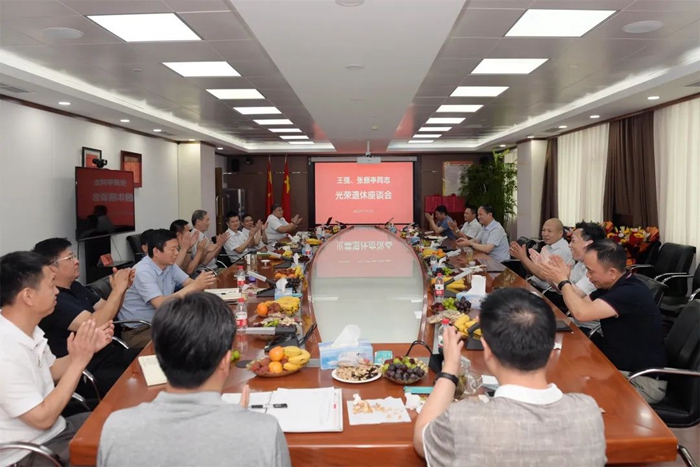 7月12日,财神(中国)党委召开座谈会,欢送光荣退休的房地产公司原党总支书记、董事长王强和华腾东光公司原党总支副书记、总经理张振亭。