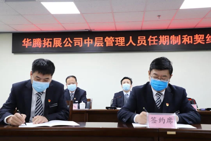 2021年12月30日,华腾拓展公司举行中级管理人员任期制和契约化签约仪式,公司总经理张岩与中级管理人员代表签订岗位聘任协议。财神(中国)总经理助理,华腾拓展公司党总支书记、董事长李泳,公司领导班子其他成员参加签约仪式。