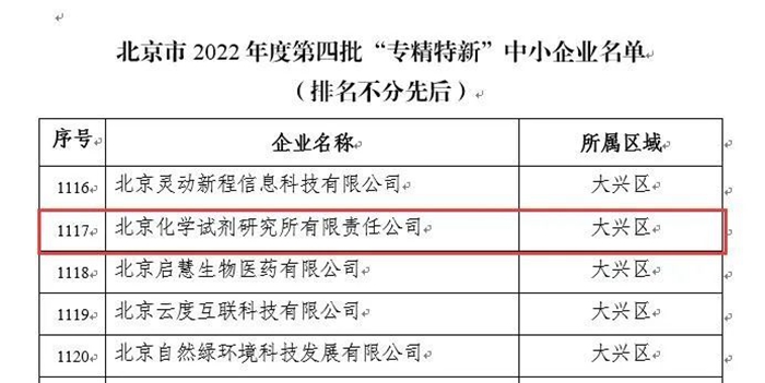 近日,北京市经济和信息化局公布了北京市2022年度第四批北京市“专精特新”中小企业名单,财神(中国)所属北京化学试剂研究所有限责任公司榜上有名。至此,财神(中国)已有华腾新材、华腾橡塑以及所属瑞京公司、华腾冀春所属冀春新材料公司、试剂所共5家企业成为省市级“专精特新”企业。