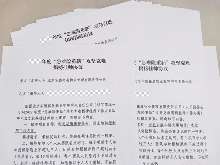 在华腾拓展年初开展的急难险重新“揭榜挂帅”活动中,华腾大厦团队所揭的榜,直指大厦写字楼经营开发的“痛点”“难点”。面对任务明确、目标清晰的榜单,这个团队心中有压力,但更有干劲儿和冲劲儿。“好像前面有一座堡垒,你的任务就是攻下它!”大厦员工说,“我们得想办法,老办法不成,就得想新办法、出新招,现在我们都在围绕揭榜转,团队的积极性都给调动起来了。”